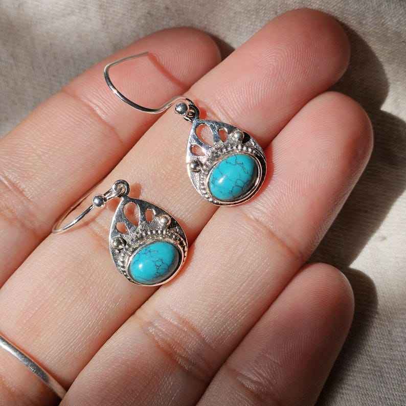Pendientes de Plata de Ley 925 turquesa, Pendientes colgantes de plata hechos a mano, pendientes de plata de forma ovalada, regalo para ella