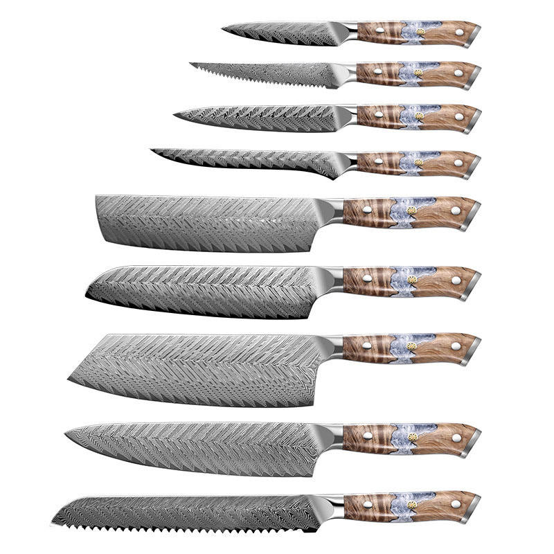 Juego de 9 Cuchillos de Cocina VG10 Damasco, Cuchillo de Chef con Mango de Madera de Resina, Cuchillo Santoku, Cuchillo para Verduras, Pan y Deshuesar, con Caja de Regalo Negra
