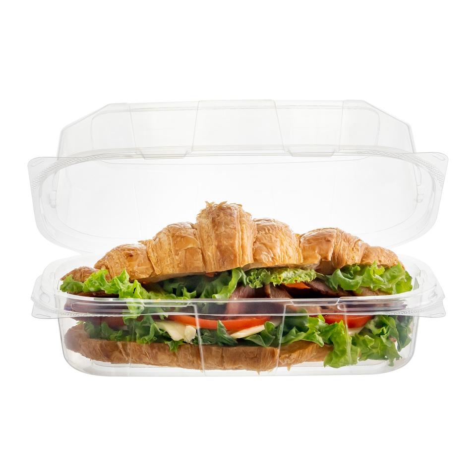 Caja de concha desechable con bisagras PET transparente de 9x5 pulgadas, contenedor de sándwich antivaho sin BPA, embalaje para impresión en relieve de alimentos