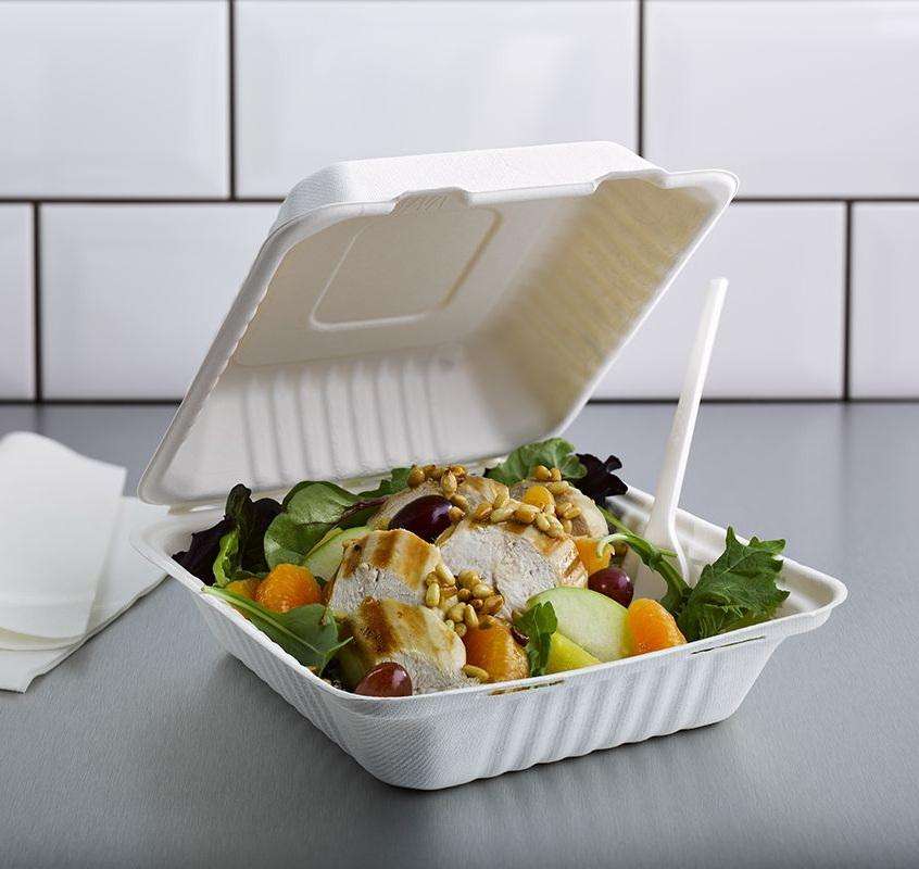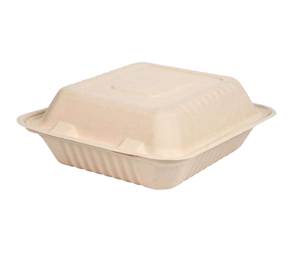 Contenedor de Alimentos Desechable de Bagazo de 9x9 Pulgadas, Ecológico y Biodegradable, Tipo Clamshell, para Uso en Restaurantes