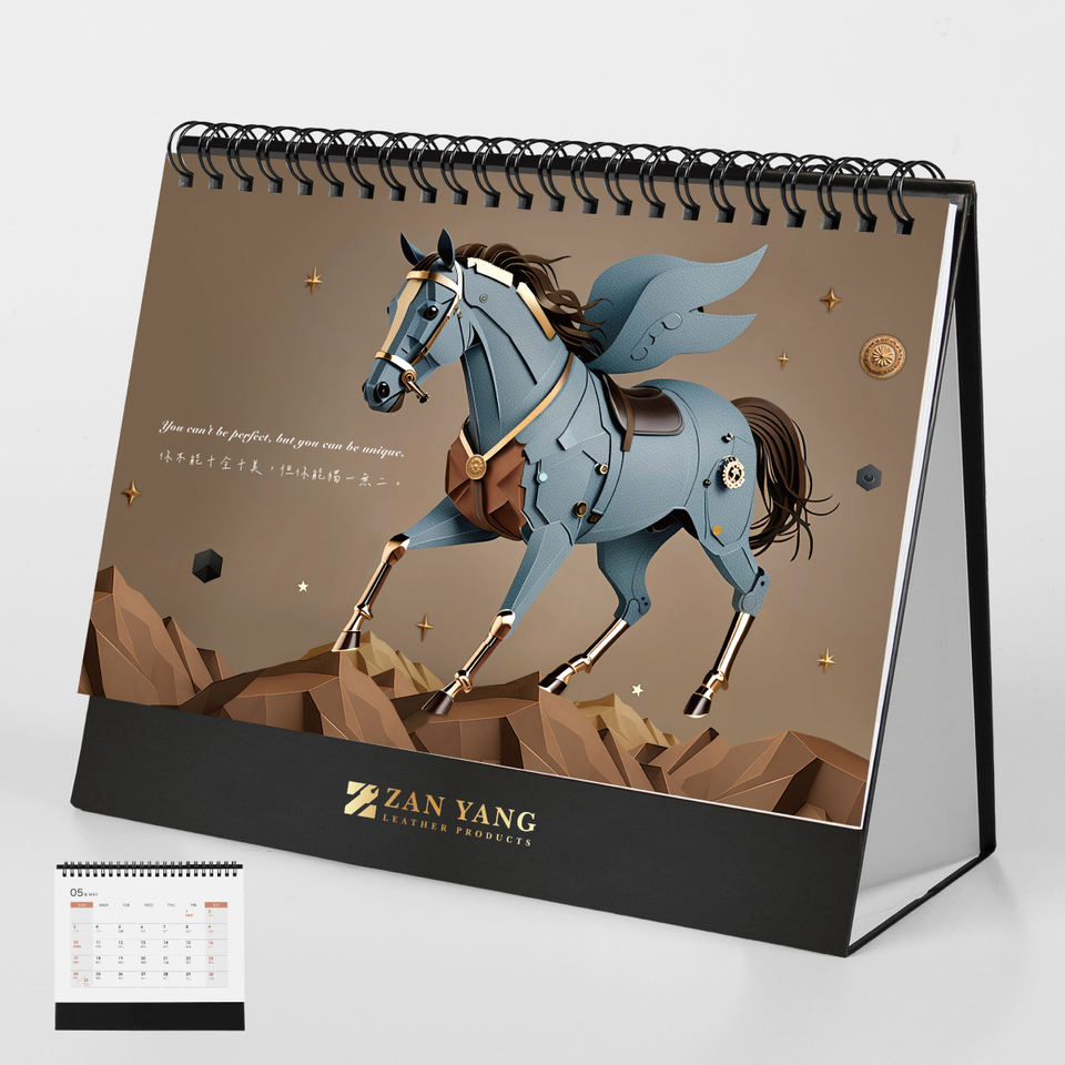 Complete Triangular Desk Calendar (23-hole spiral) 200g copper foil, matte finish on base, thick cardboard mounting (customizable with gold or silver foil logo), imported PU leather textureMaterial de la cubierta