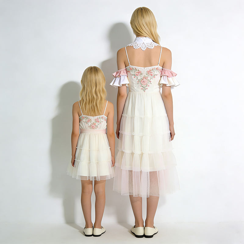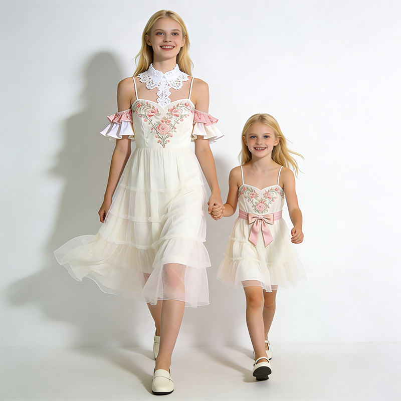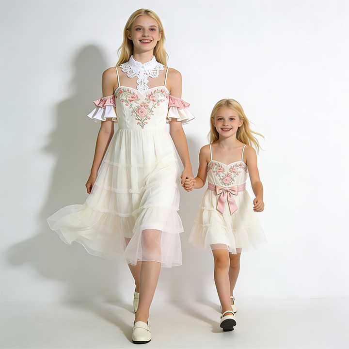 Vestido Largo Casual Plisado de Malla Bordado Personalizado de Alta Calidad A&J para Adolescentes Hermanas, Fabricante Mayorista de Fábrica