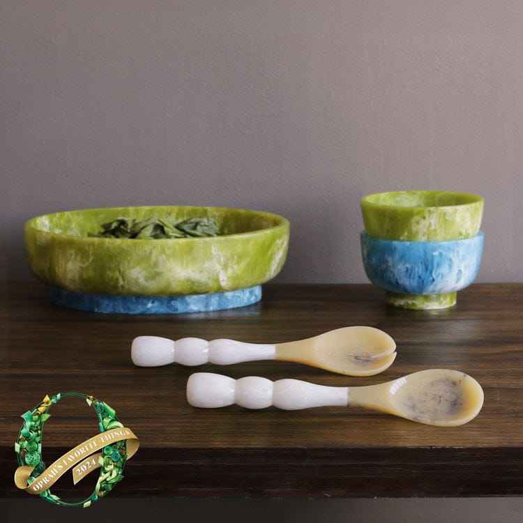 Una versión más pequeña, el tazón pequeño de resina con base se muestra apilado demostrando su uso para porciones individuales