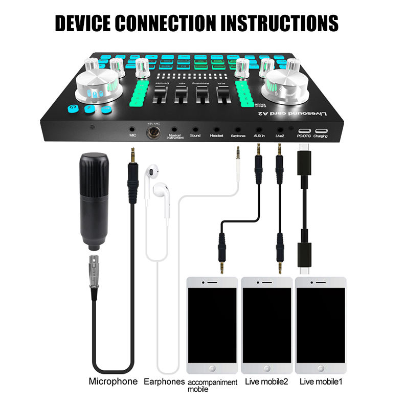 Mezclador de tarjeta de sonido de audio en vivo USB A2 con interfaz OTG de alimentación fantasma de 48V tarjeta de sonido cambiador de voz
