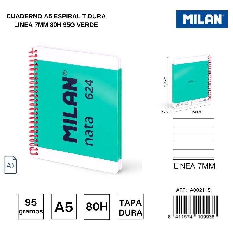 Cuaderno espiral A5, forrado, 7mm, 80g, 95g, verde-Cuadernos escolares y de oficina