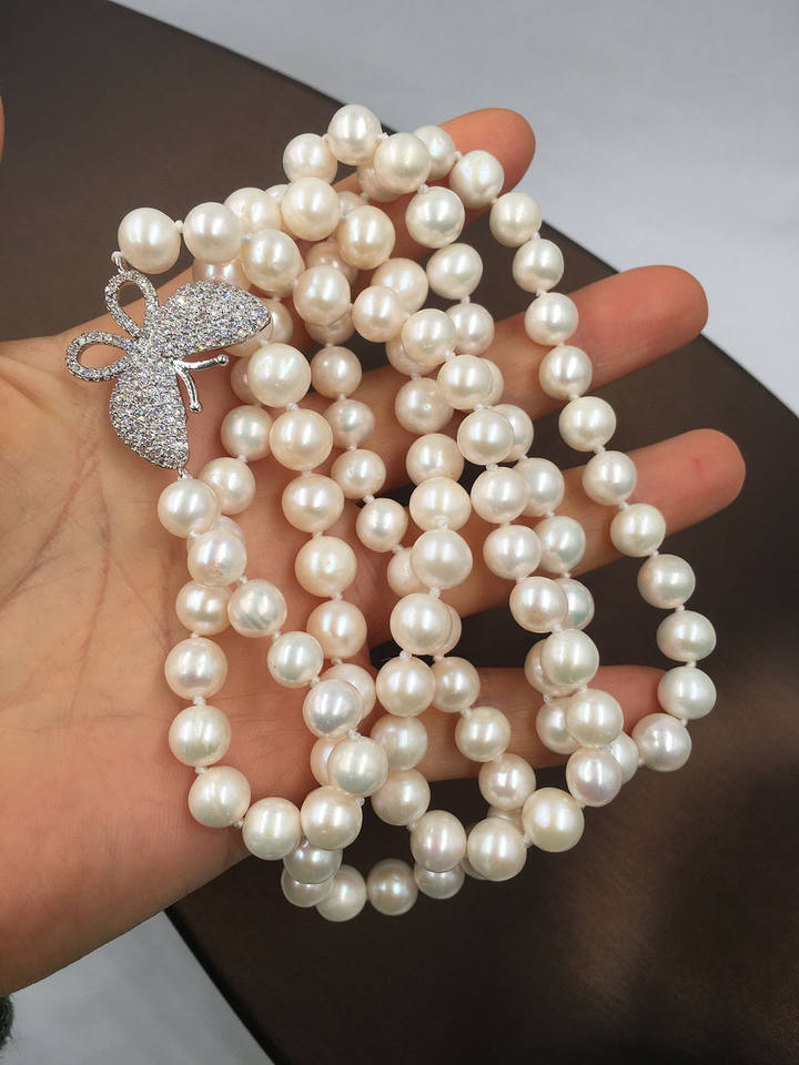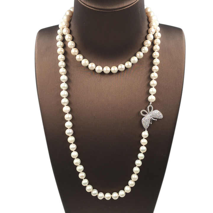 Collar de perlas de agua dulce de 90 cm de largo de grado AA, suéter redondo de 7-8mm, perla con accesorios de mariposa, collar natural de buena calidad