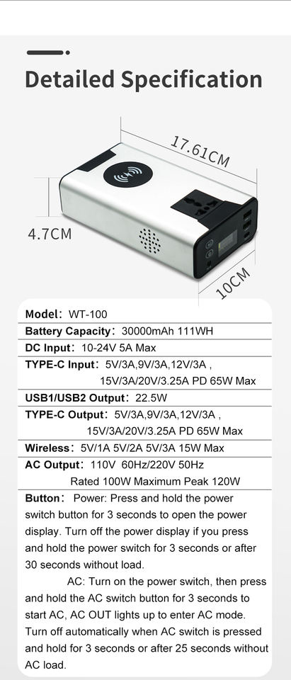 Salida:AC100W, PD65W, Inalámbrico 15W, USB-A 22.5W