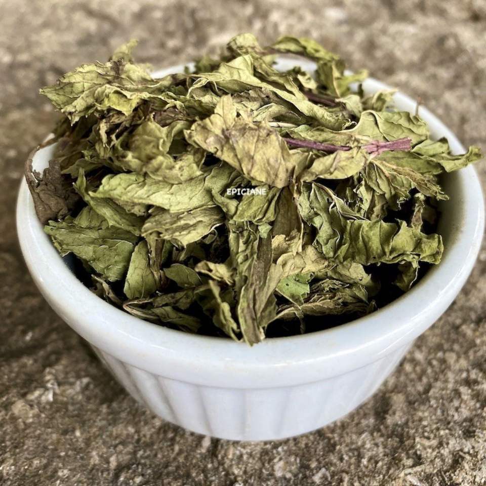 Hojas de menta crudas, etiquetadas como ingredientes limpios, para refuerzo inmunológico natural, té de hierbas y cocina saludable.