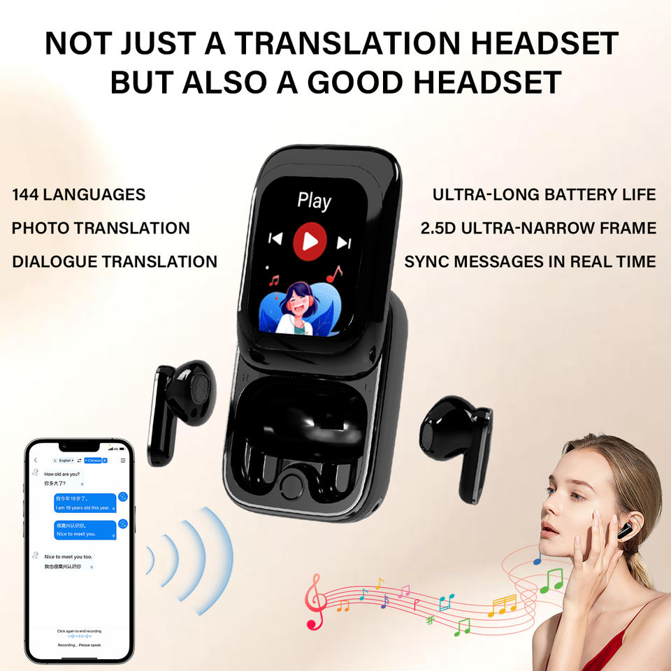 Auriculares de traducción de idiomas AI, pantalla LCD TWS, traductor en tiempo real con pantalla táctil para 144 idiomas y acentos, dispositivo de traducción