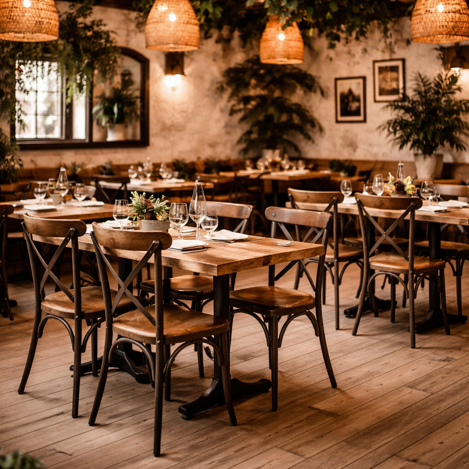 Silla de Comedor AKKU ART con Respaldo Cruzado de Metal y Asiento de Madera | Asientos para Restaurantes y Bistrós Industriales | Silla de Café Apilable Estilo Vintage Loft
