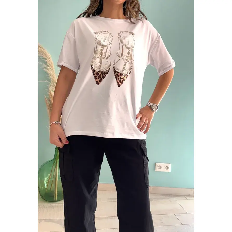 Camiseta blanca ALICE de manga corta con estampados de zapatos de leopardo