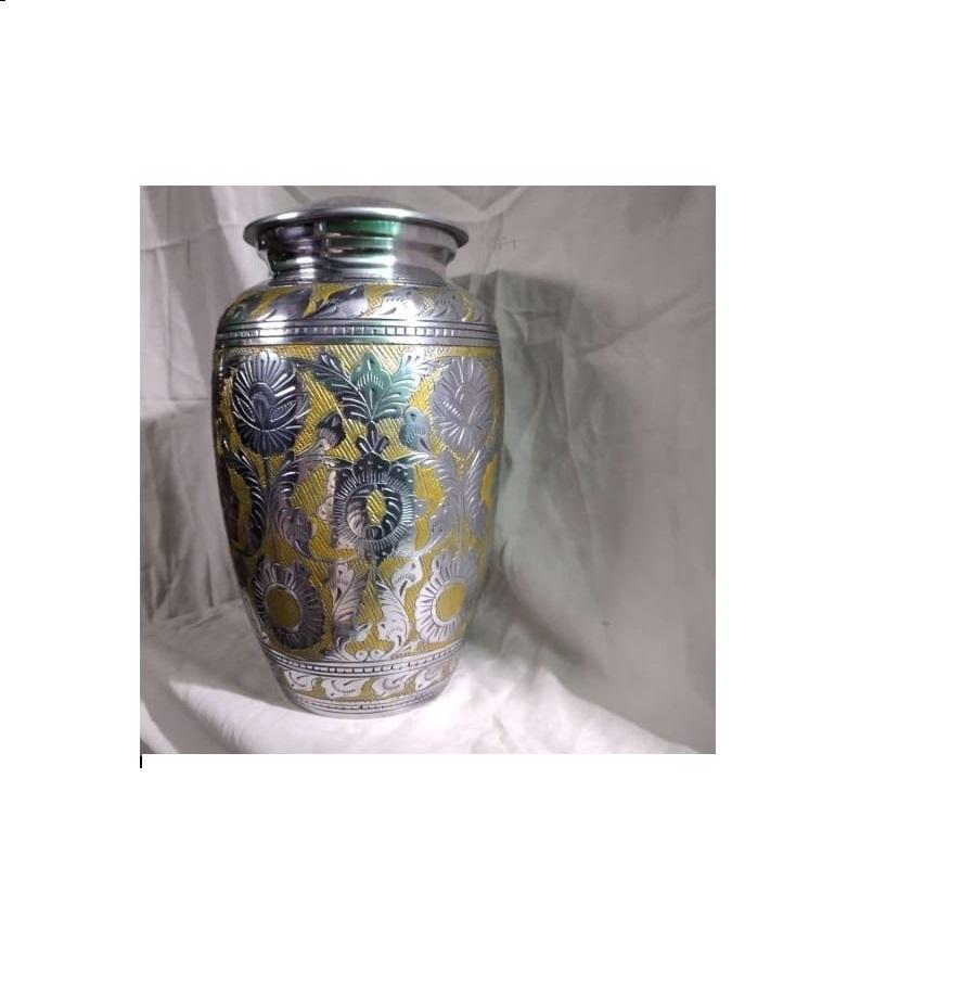 Urna Funeraria de Aluminio Plateado con Grabado Floral para Adultos, Estilo Americano, Brassworld India