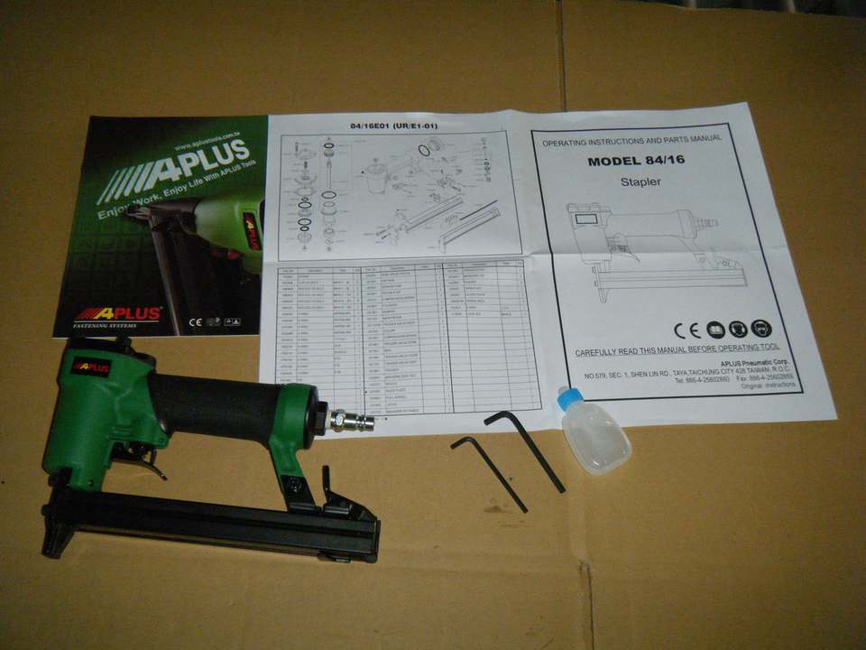 APLUS 84/16, Grapadora Neumática de 12.3mm para Muebles, Doble Gatillo, Carga Inferior, Escape Superior