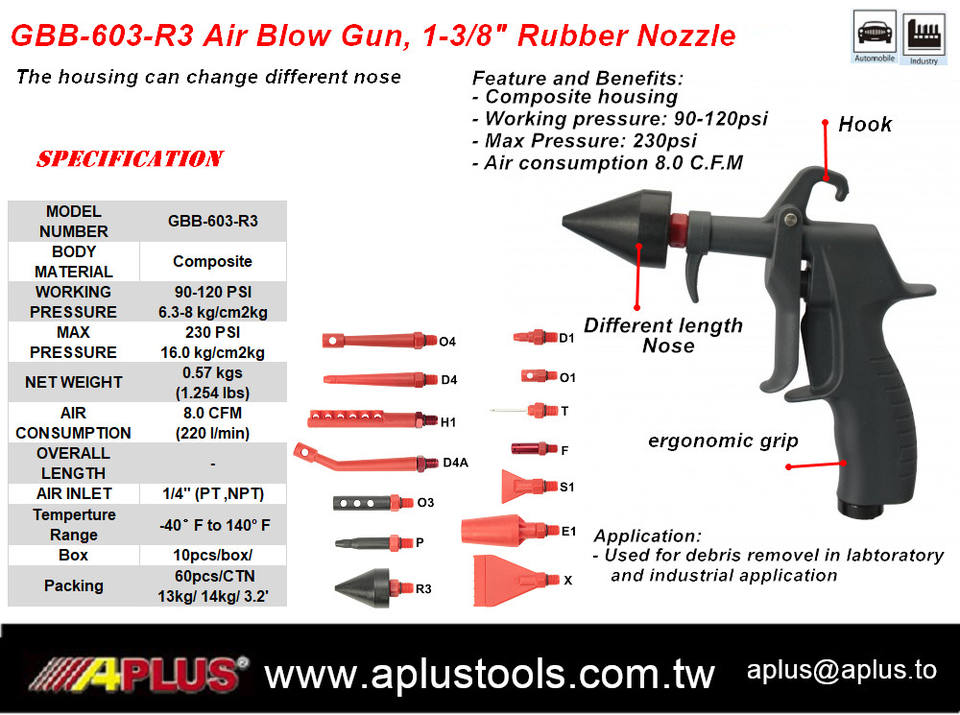 Pistola de aire comprimido APLUS, boquilla de goma de 1-3/8 ", carcasa compuesta y boquilla