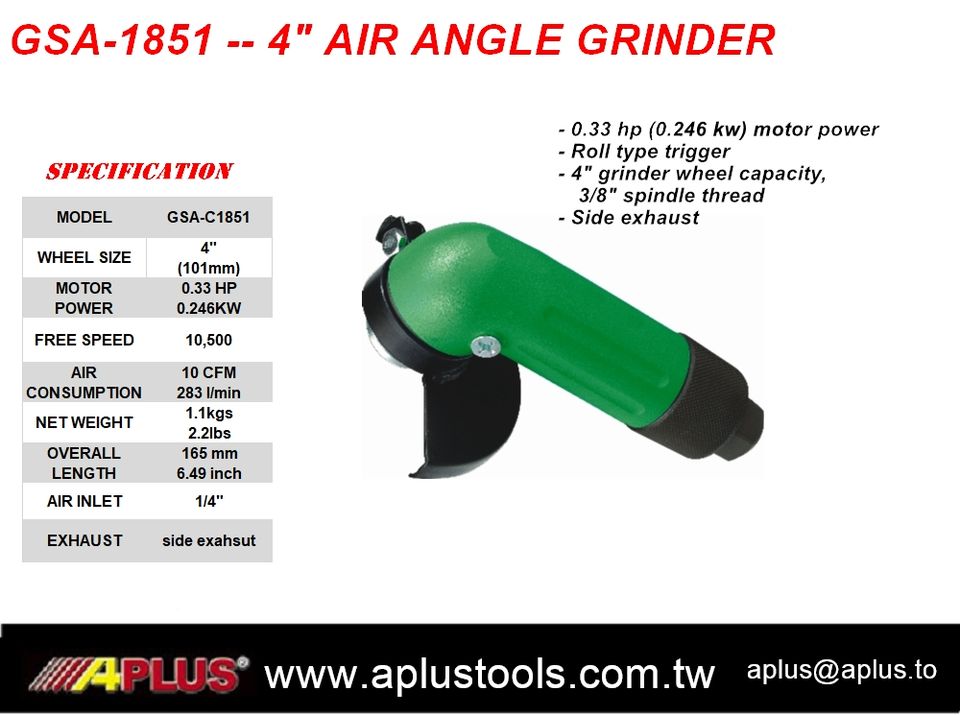 Amoladora angular de aire neumática APLUS, tamaño de rueda de 4 ", 0.33hp, 10.500 Rpm, gatillo de rodillo, certificado verde ISO9001,