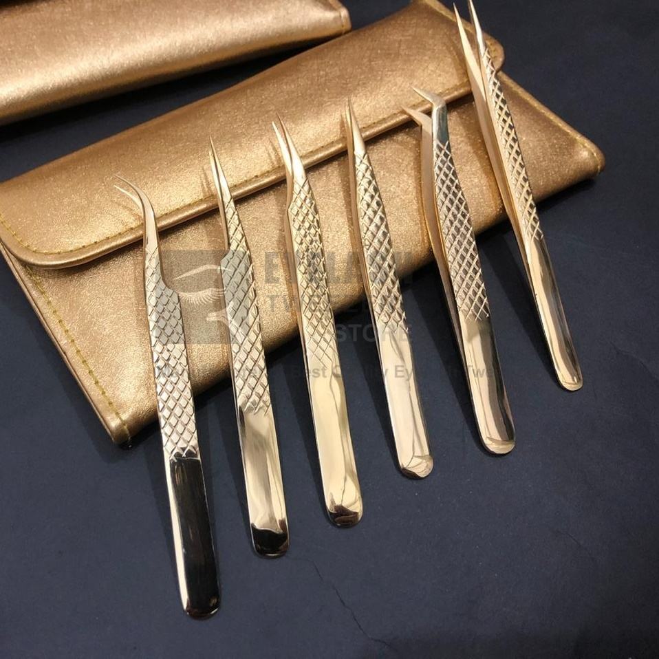 Pinzas de extensión de pestañas de acero inoxidable sostenibles japonesas con acabado brillante chapado en oro y logotipo personalizado de ASB, Diamante probado a mano