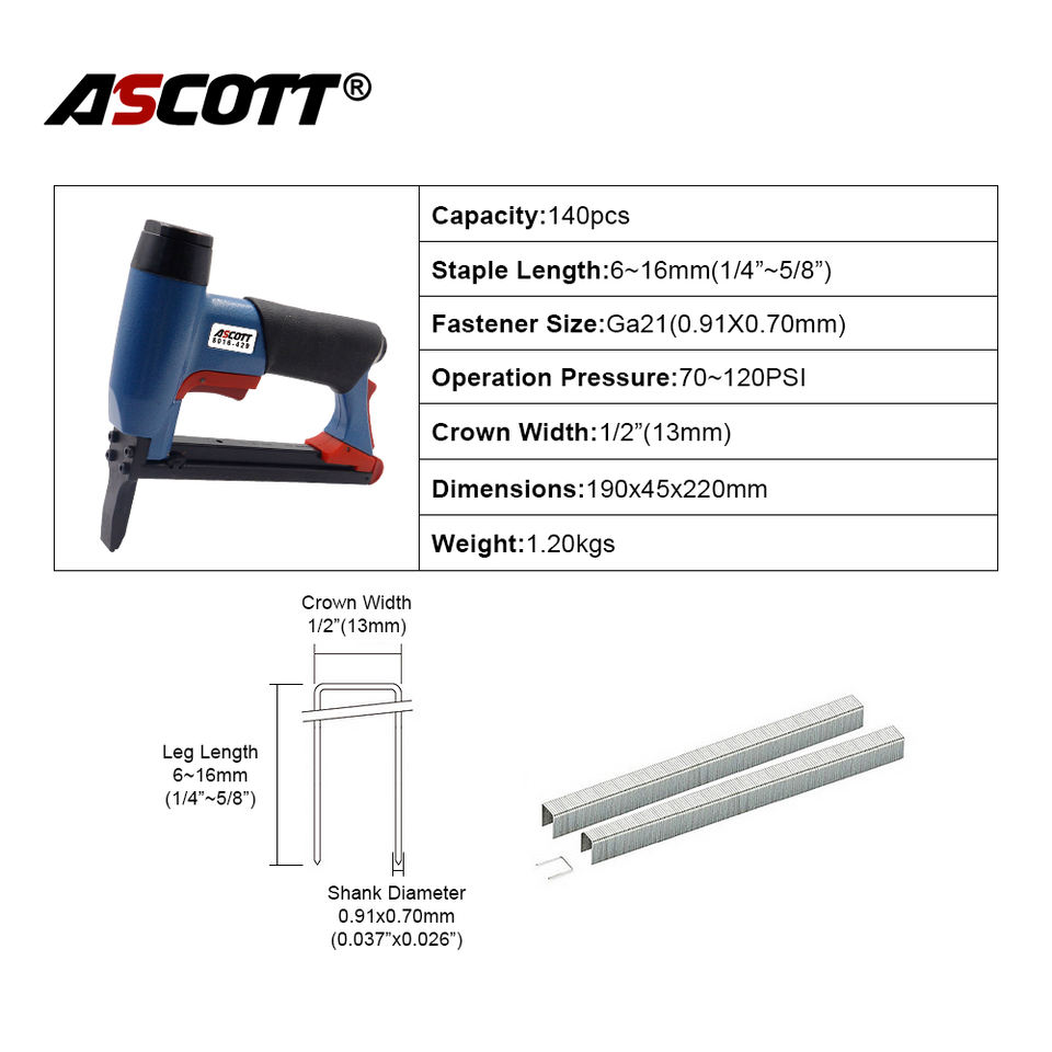 ASCOTT 21GA Grapadora Neumática de Madera de Punta Larga 8016, Clavadora Neumática Industrial y para Bricolaje de Acero, Pistola de Grapas Finas para Tapicería