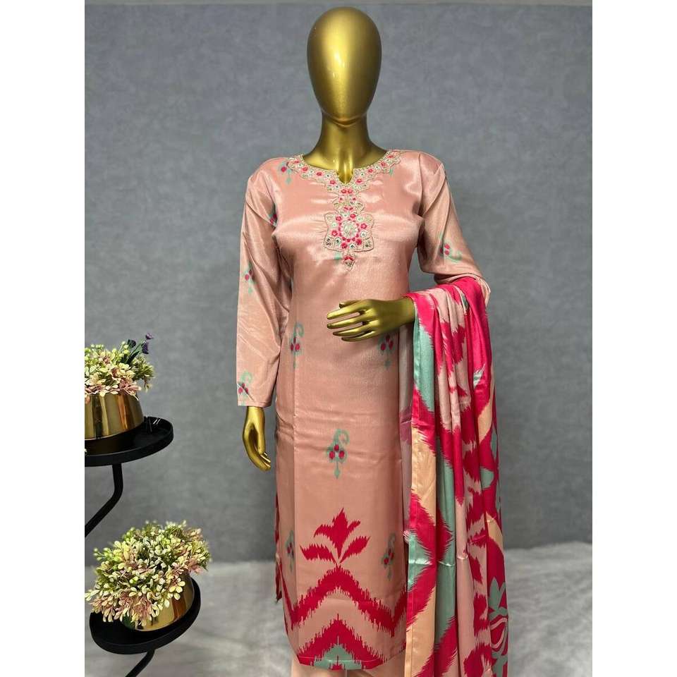 Conjunto de Pantalón y Top de Seda Chinon con Estampado Digital Atractivo y Bordado con Lentejuelas, con Dupatta