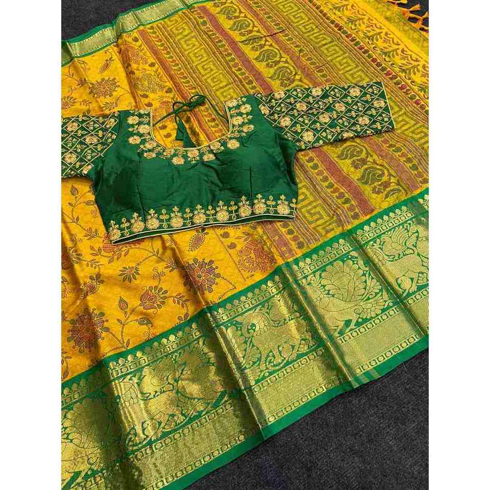 ATRACTIVO ALGODÓN ESTAMPADO TRABAJO SAREE CON BLUSA LISTO AMARILLO