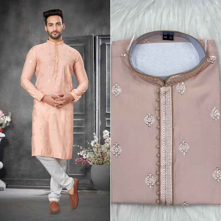 ATRACTIVO ALGODÓN SEDA BORDADO TRABAJO HOMBRE KURTA CON PIJAMA MELOCOTÓN