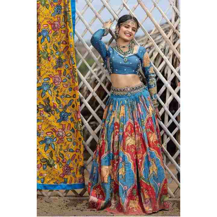 CREPÉ ATRACTIVA ESTAMPADO KALAMKARI TRABAJO LEHENGA CHOLI CON DUPATTA SKY