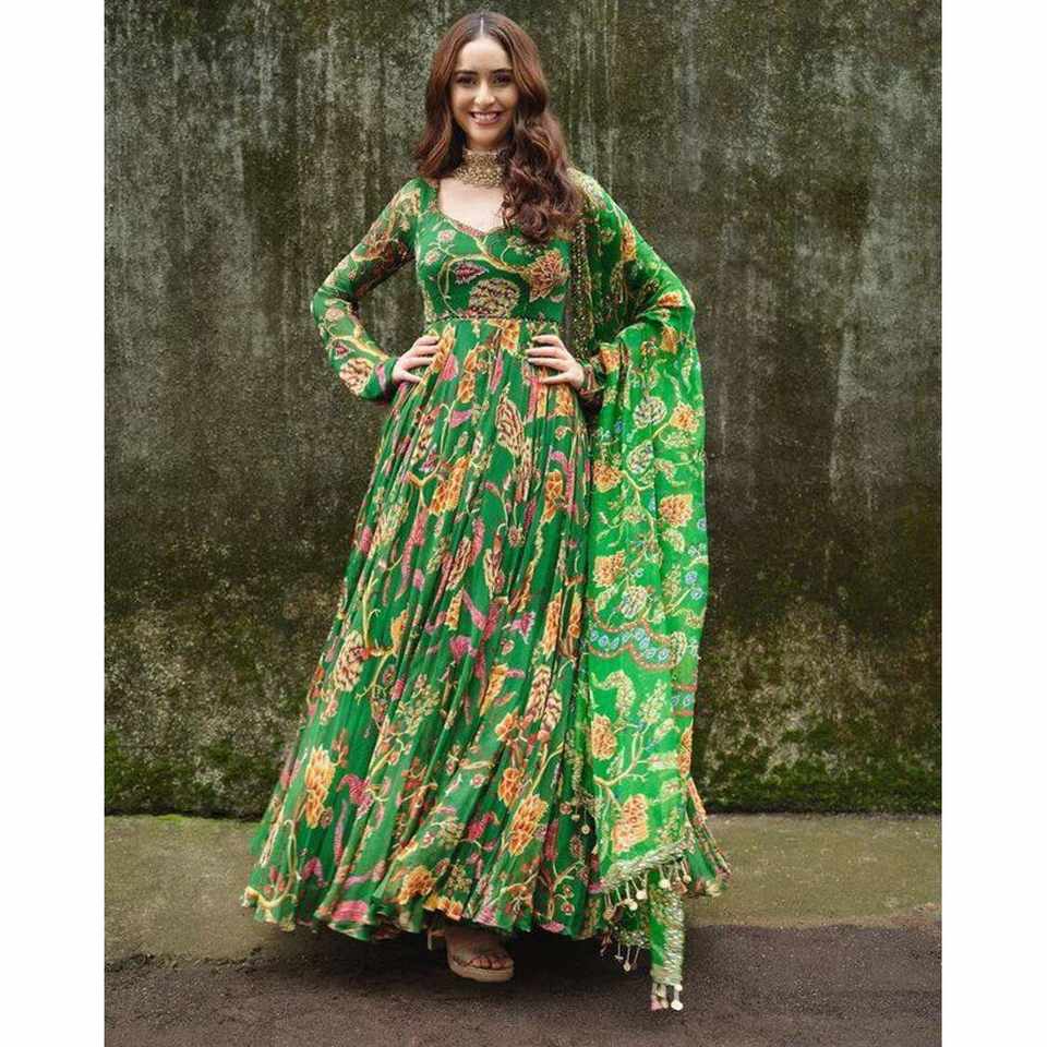 Atractivo vestido de trabajo de encaje con estampado digital Georgette con Dupatta Perrot Green
