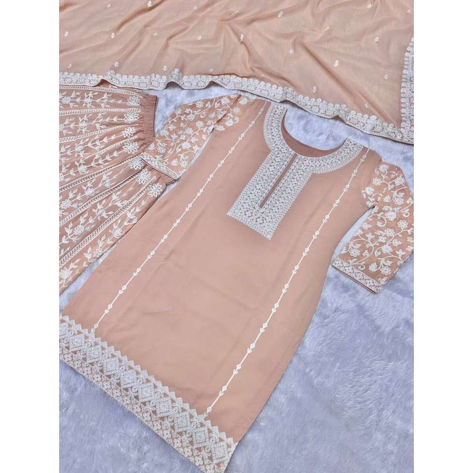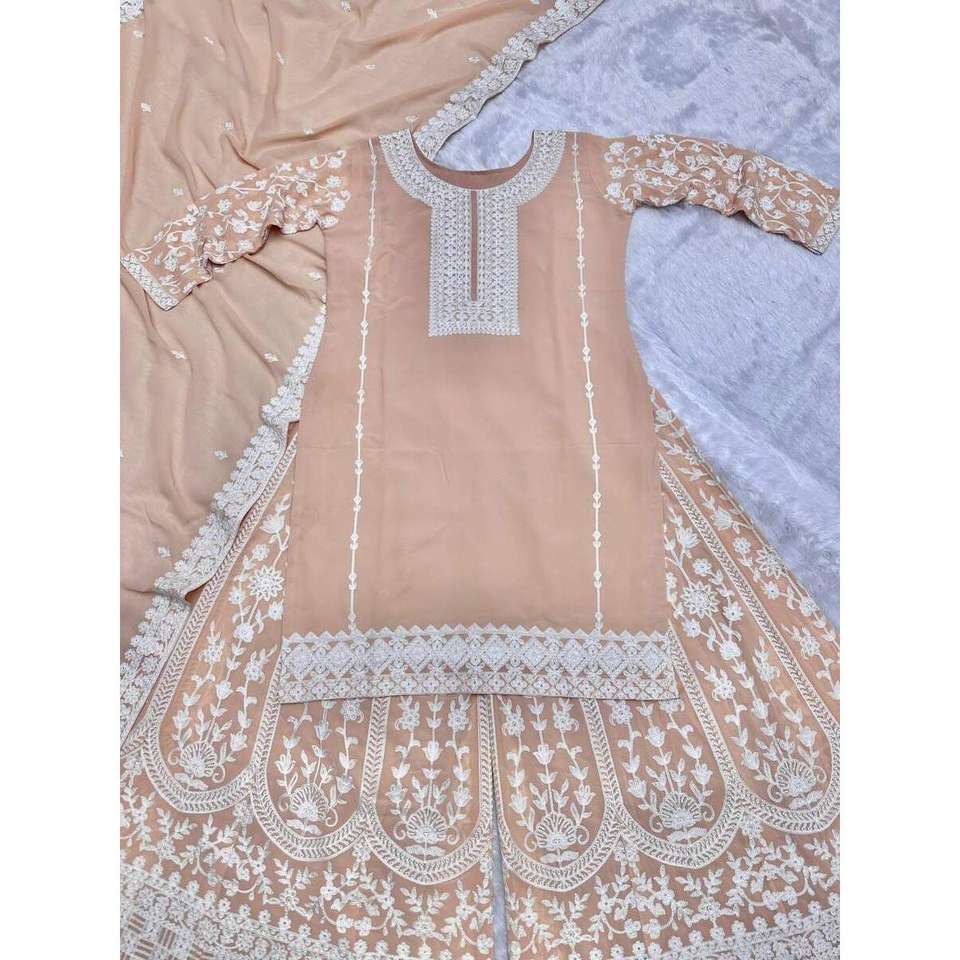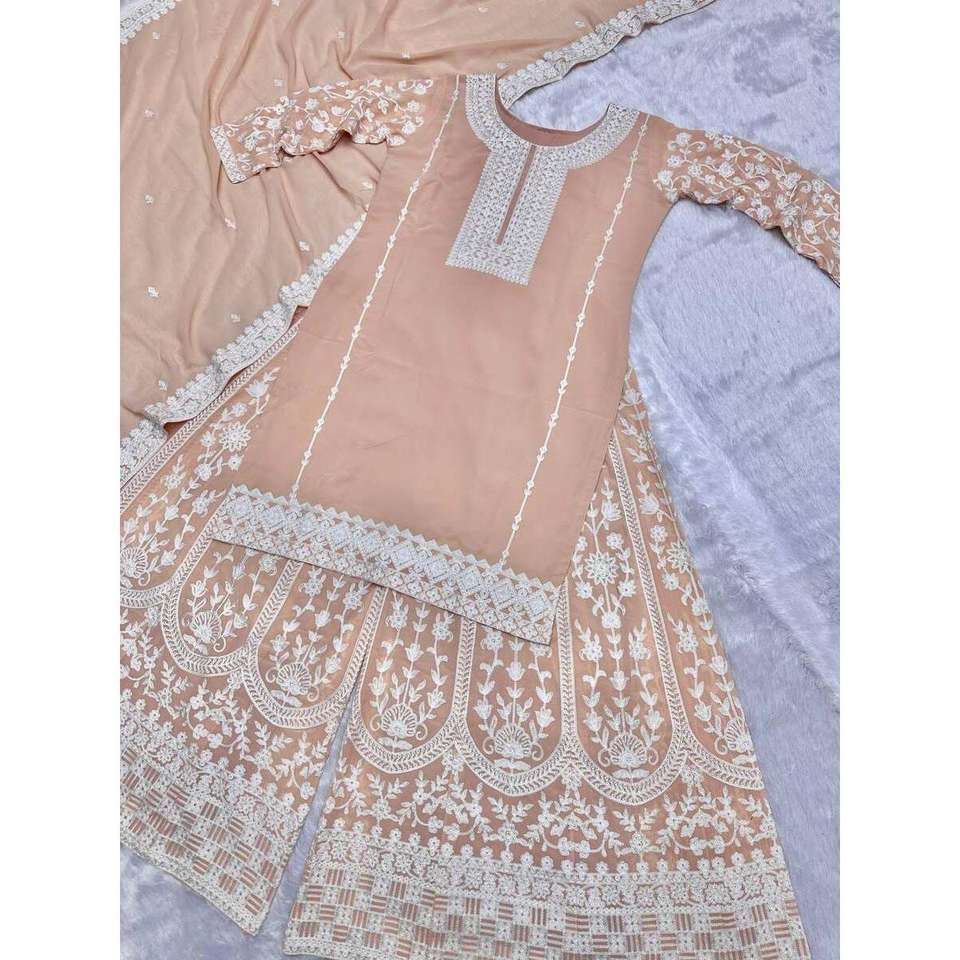 Atractivo Conjunto de Top y Palazzo con Bordado Georgette y Cadena Cosida, con Dupatta
