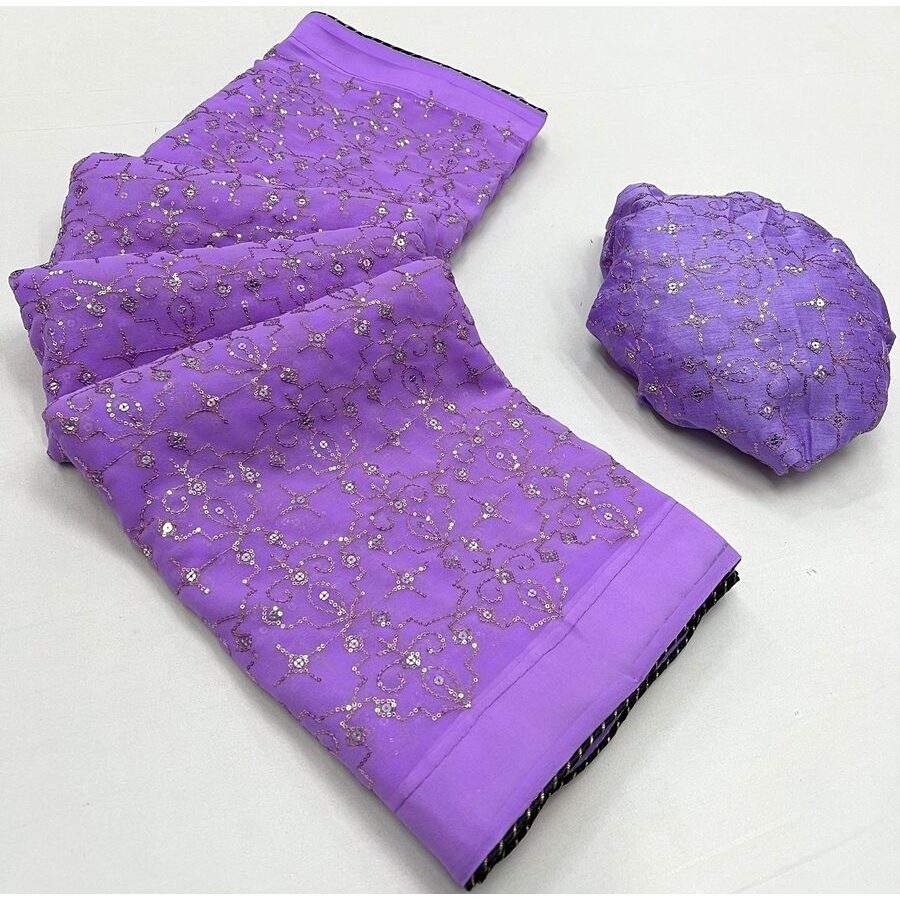 ATRACTIVE GEORGETTE SECUENCIA BORDADO TRABAJO SAREE CON BLUSA SIN COSTAR LAVANDA