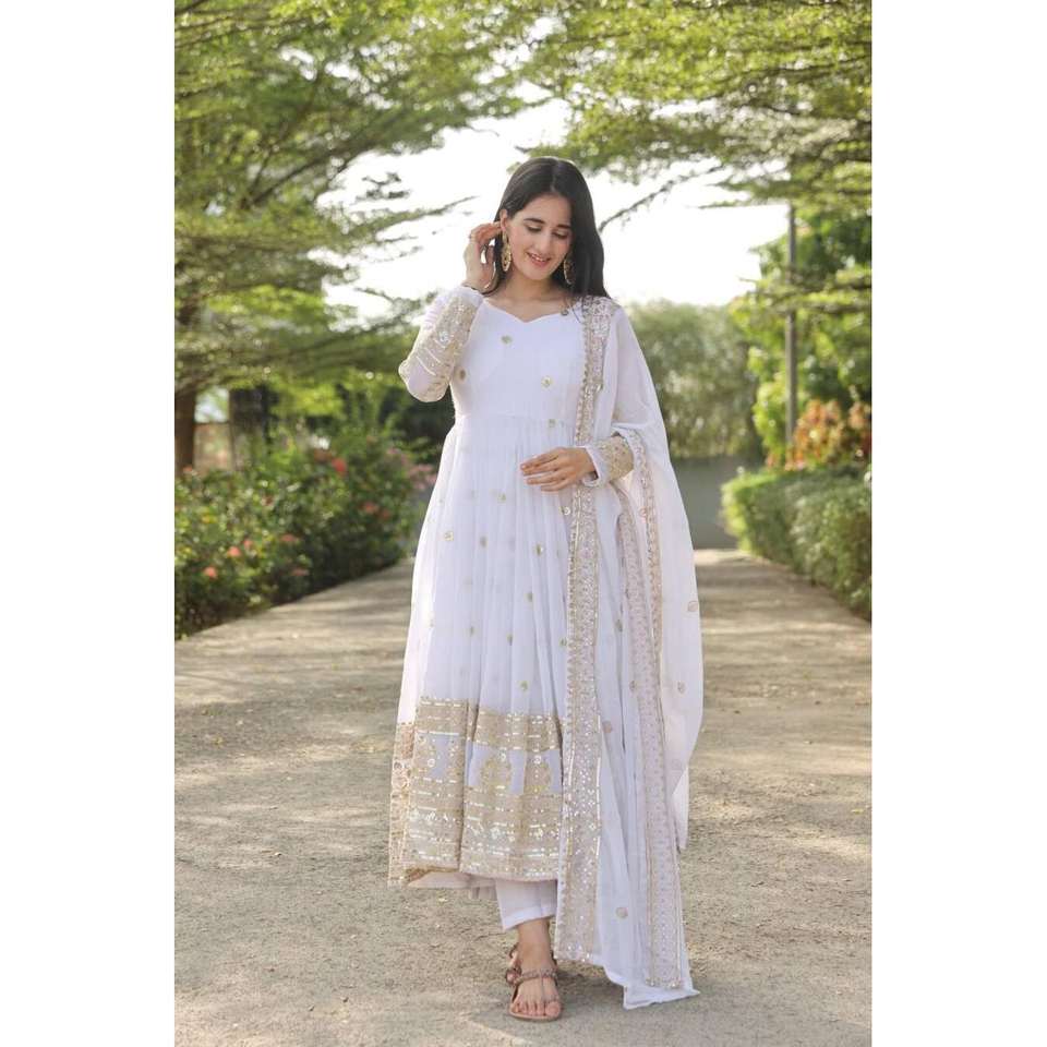 Atractivo Conjunto de Pantalón y Blusa de Georgette con Bordado de Lentejuelas y Zari, con Dupatta en Blanco