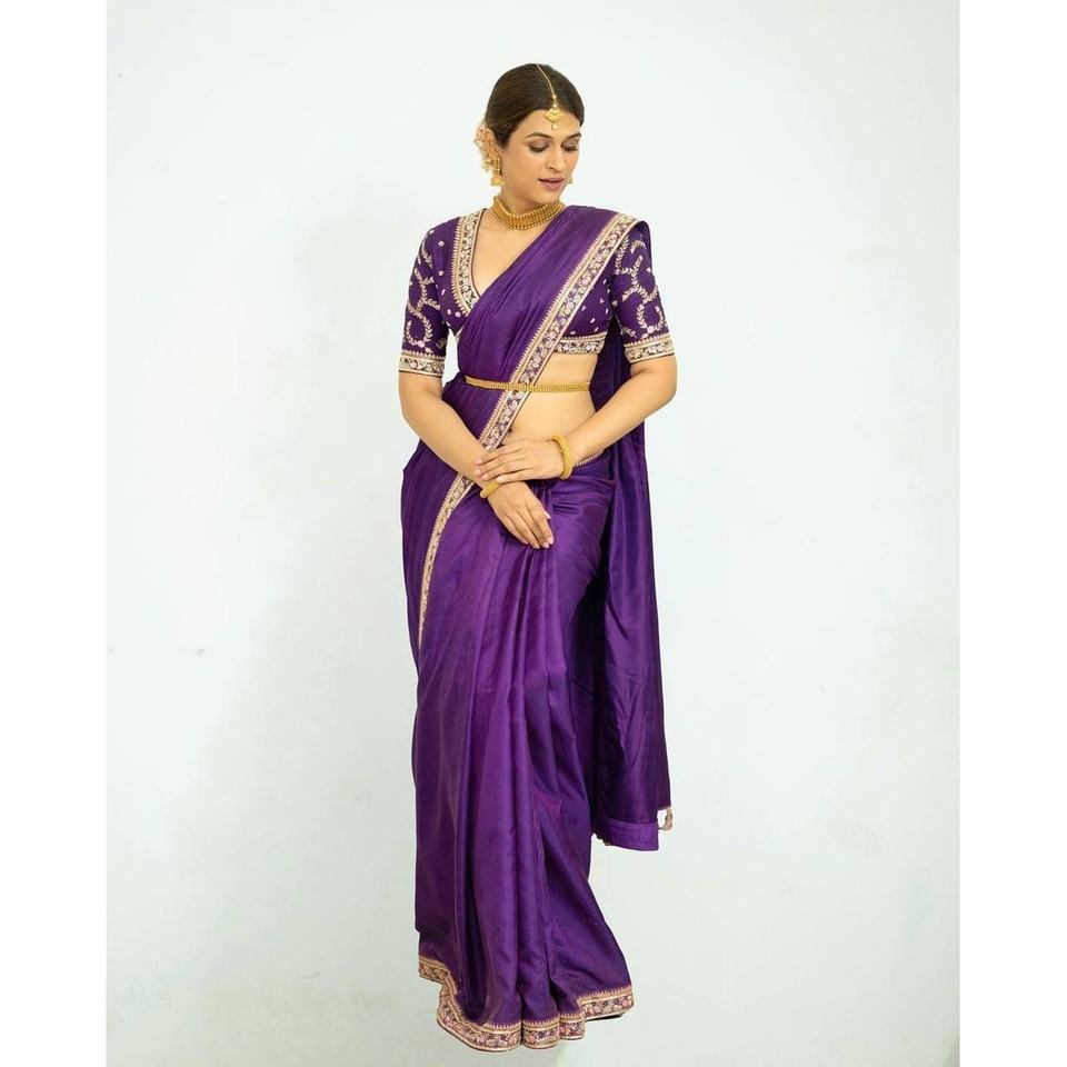 ATRACTIVO JAPÓN BORDADO DE SATÉN SECUENCIA TRABAJO FRONTERA SAREE CON BLUSA DESCOSADA PÚRPURA