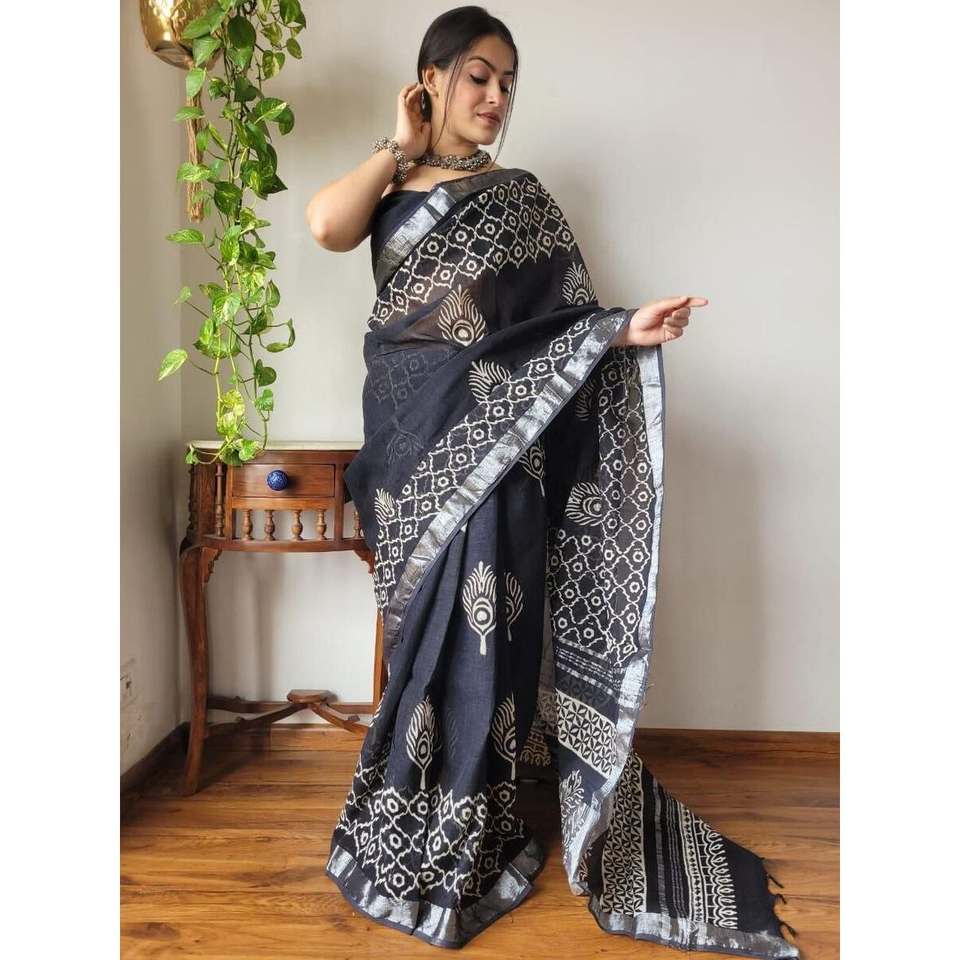ATRACTIVA IMPRESIÓN DIGITAL DE LINO CON BORDE DE PLATA TRABAJO SAREE CON BOLUSE SIN COSTAR NEGRO