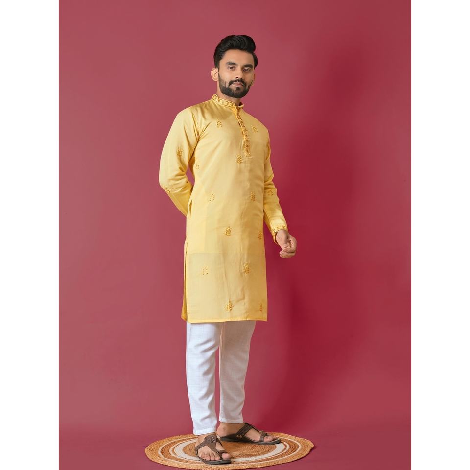 ATRACTIVO ROMAN SEDA MOTI TRABAJO A MANO HOMBRE KURTA CON PIJAMA AMARILLO Achkan Bandhgala Sherwani