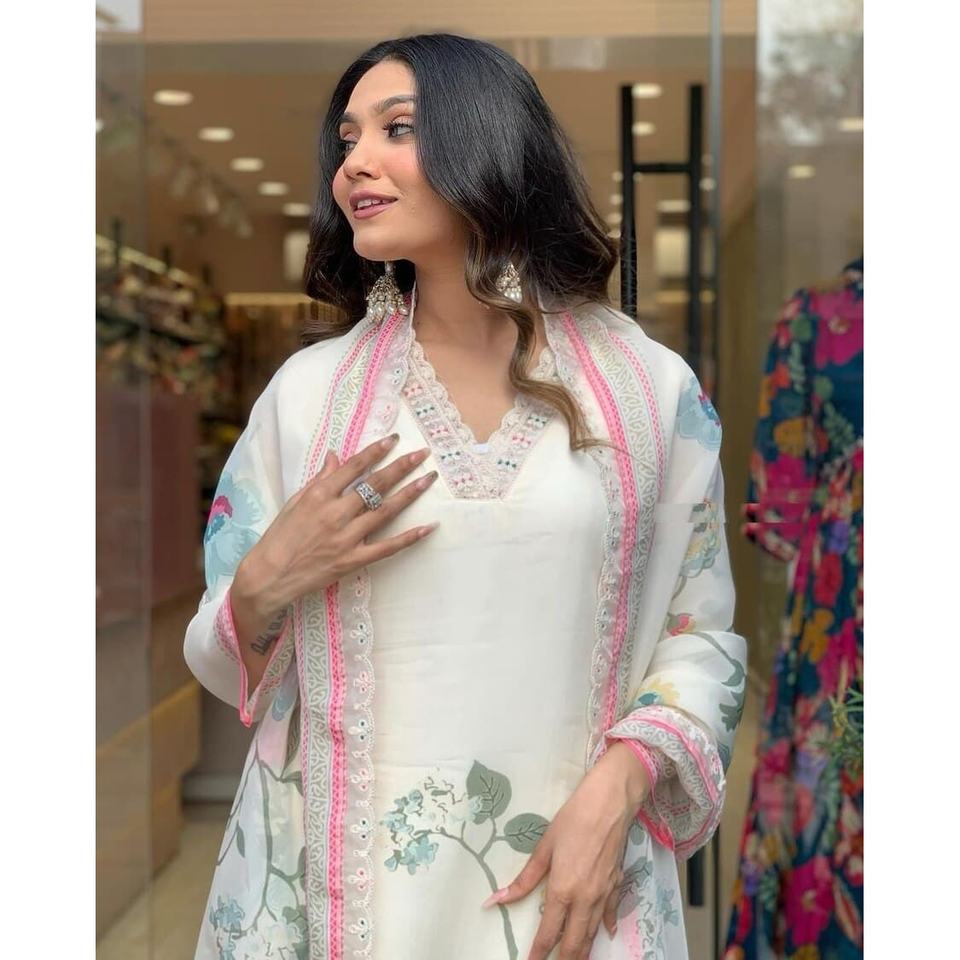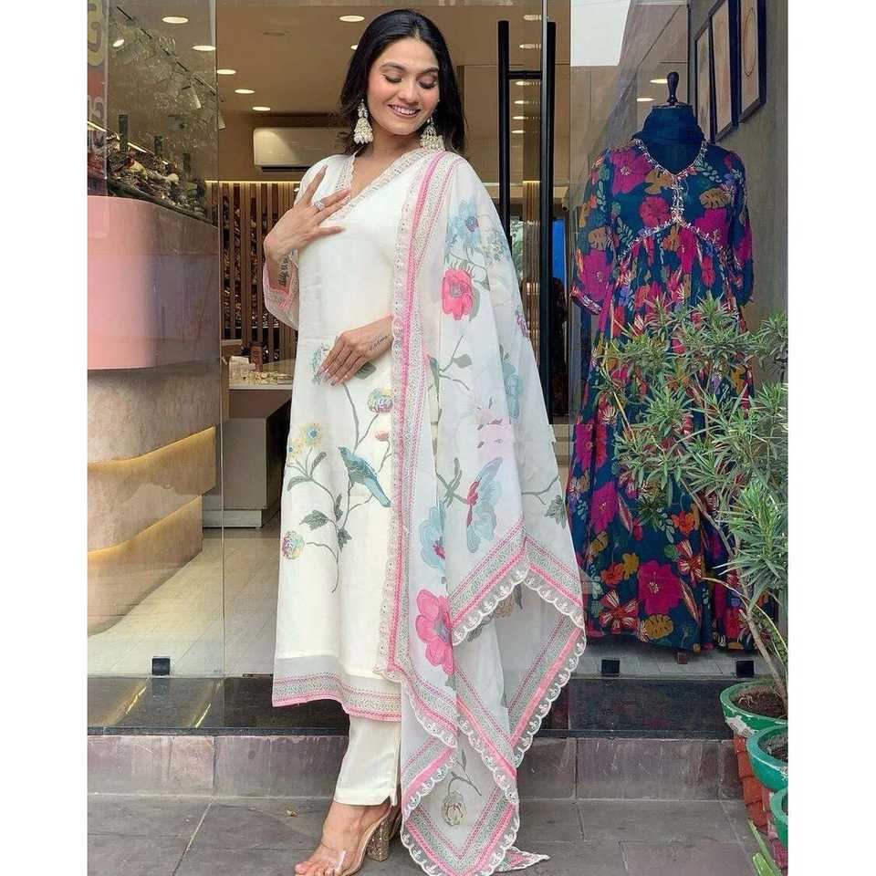 ATRACTIVE TB SILK DIGITAL PRINT WORK TOP BOTTOM CON DUPATTA WHITE