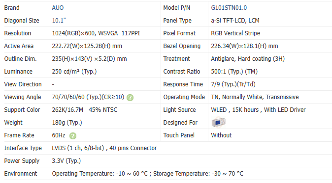 Módulo LCD de Grado Industrial AUO, Pantalla TFT Industrial de 10.1 Pulgadas, 1024*600, 250nits, Monitor TFT G101STN01.A /G101SAN01.A