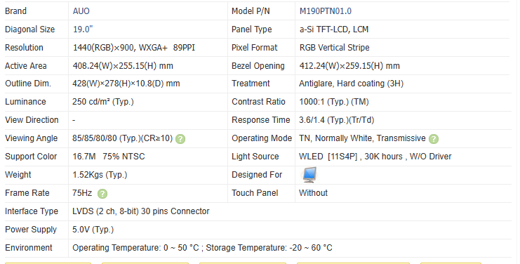 Nombre del Producto:M190PTN01.00