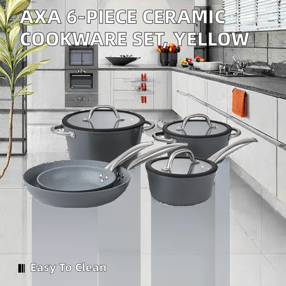 Juego de Utensilios de Cocina Ecológicos AXA, Cerámica Antiadherente No Tóxica, Revestimiento de Esmalte Amarillo, Utensilios de Metal con Tapas de Vidrio