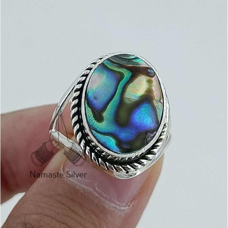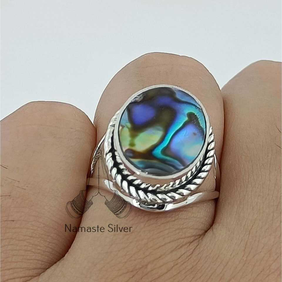 Anillo de Plata con Abulón, Estilo Boho, Hecho a Mano, Incrustaciones de Concha de Paua, Regalo Boho Original para Ella, con Joyería Única de Abulón