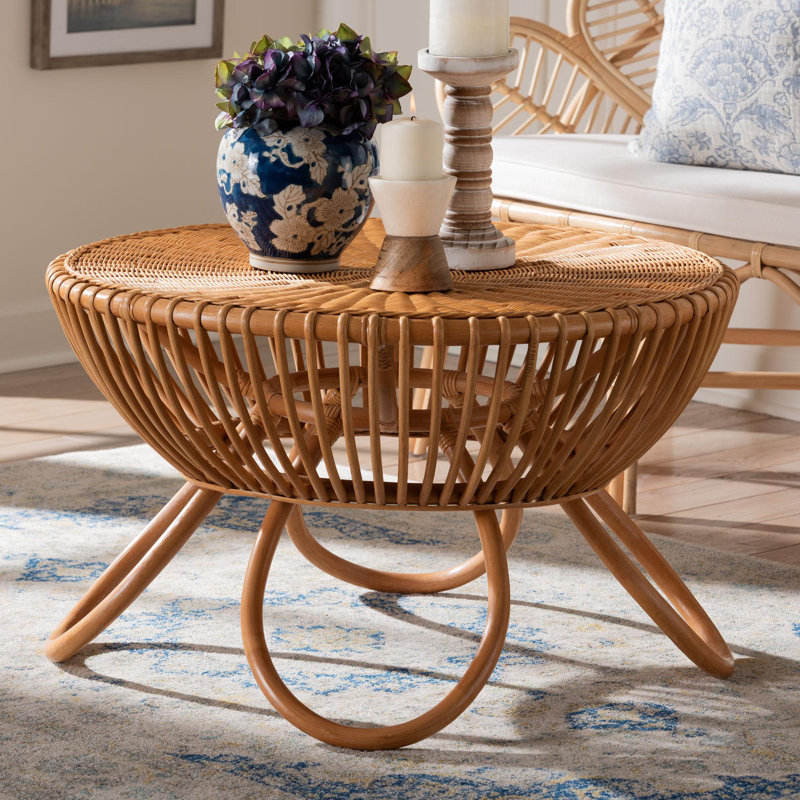 Abel Natural hecho a mano Boho Accent Mesa de centro con patas extendidas Luz Miel Ratán Estilo bohemio único