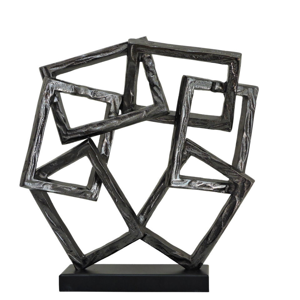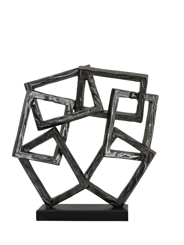 Escultura de Aluminio Geométrica Abstracta con Cuadrados Entrelazados, Arte Metálico Texturizado en Plata y Carbón, Decoración con Pedestal para Hogar u Oficina
