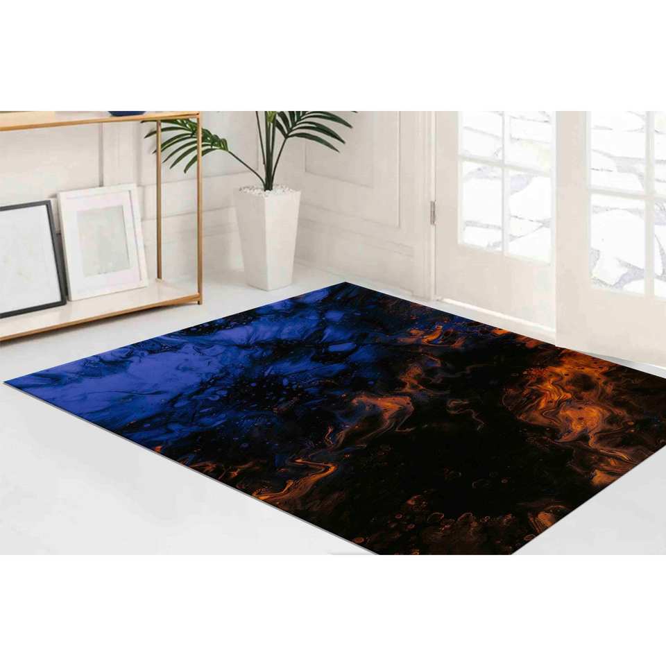 Alfombra Abstracta de Mármol: Azul Oscuro y Naranja, Decoración de Arte Moderno, Alfombra Delgada No Tejida
