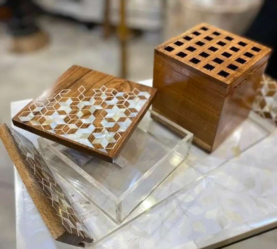 Juego de quemador Oud Bakhoor de madera de acacia y nácar con caja de chocolate acrílico hecha en la India hecha a mano por God Grace Overseas