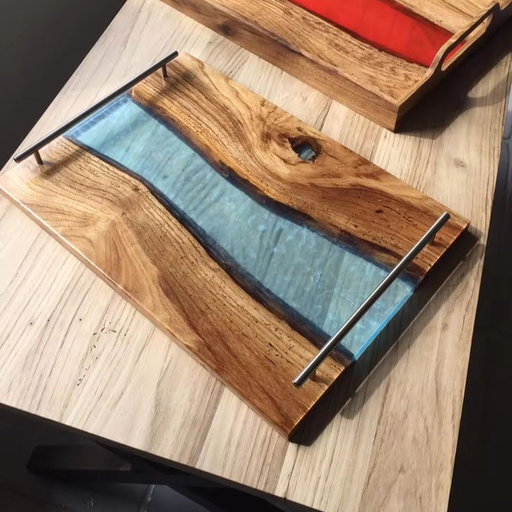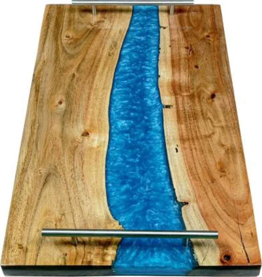 Bandeja de madera de acacia y resina epoxi, mango de acero inoxidable personalizado, bandeja de servicio de madera epoxi de resina de excelente calidad decorativa