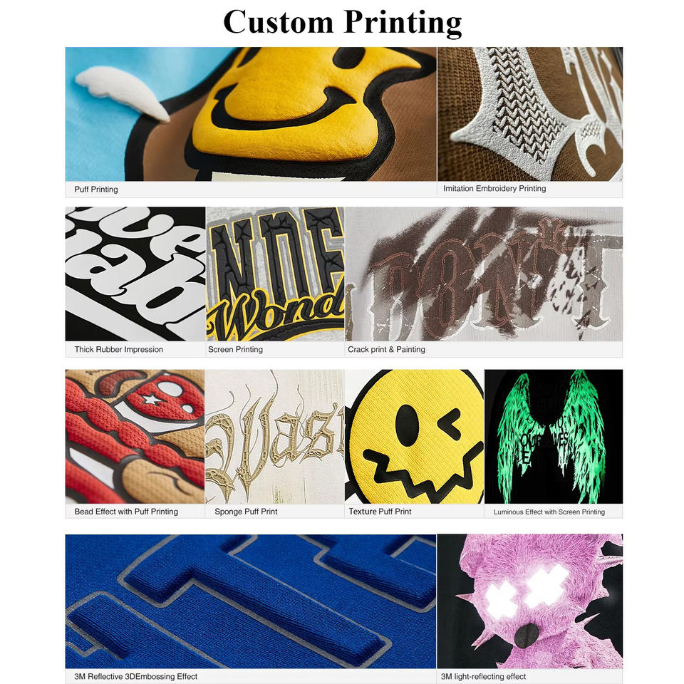 Métodos de impresión:Tie-dye, Impresión de ráfaga, EMBOLSADO, Impresión DE LA Transferencia de Calor, Impresión digital, IMPRESIÓN DE PANTALLA DE SEDA