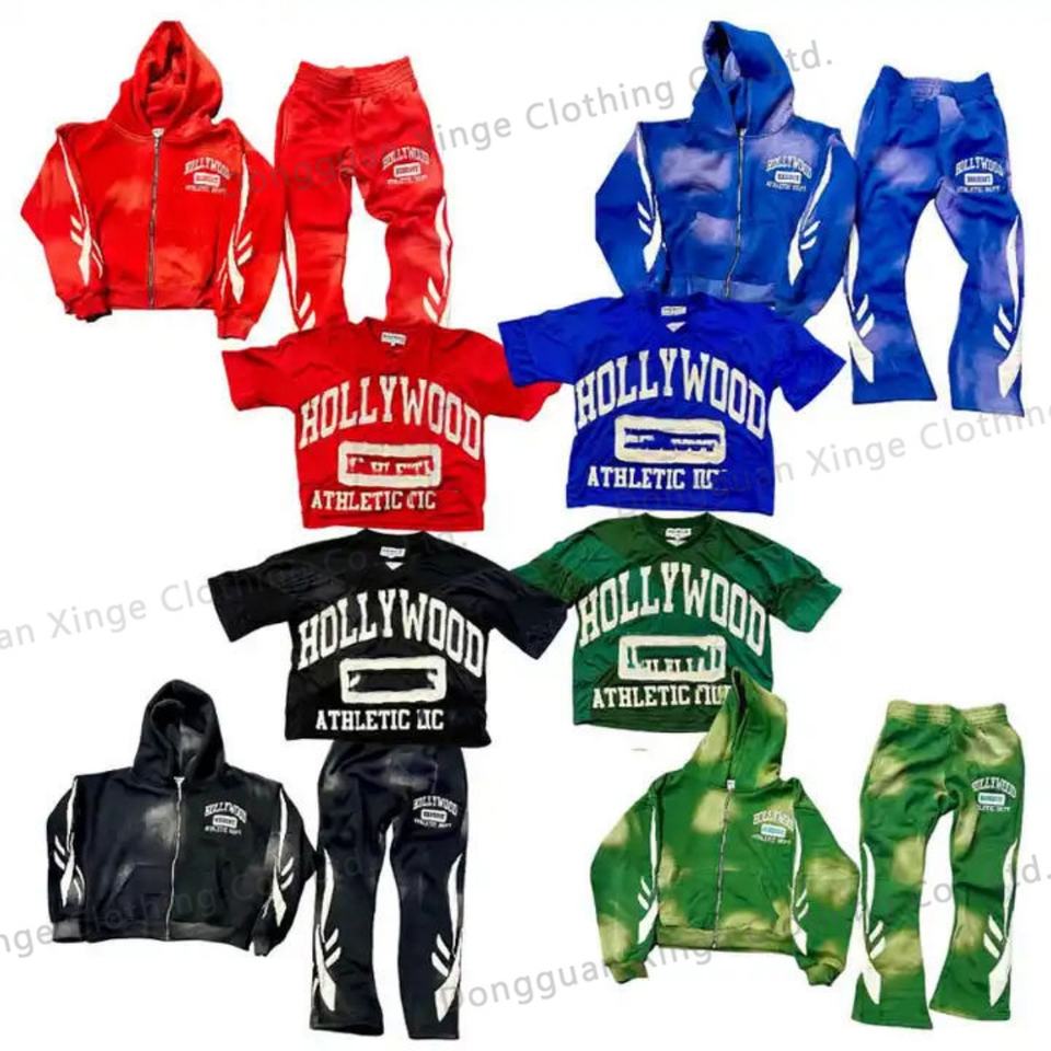 Conjuntos de sudadera y pantalón de chándal de invierno para hombre, de algodón grueso, con lavado ácido, cremallera, apliques, bordados y parches, con capucha