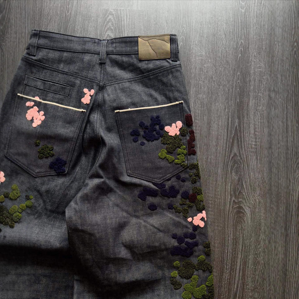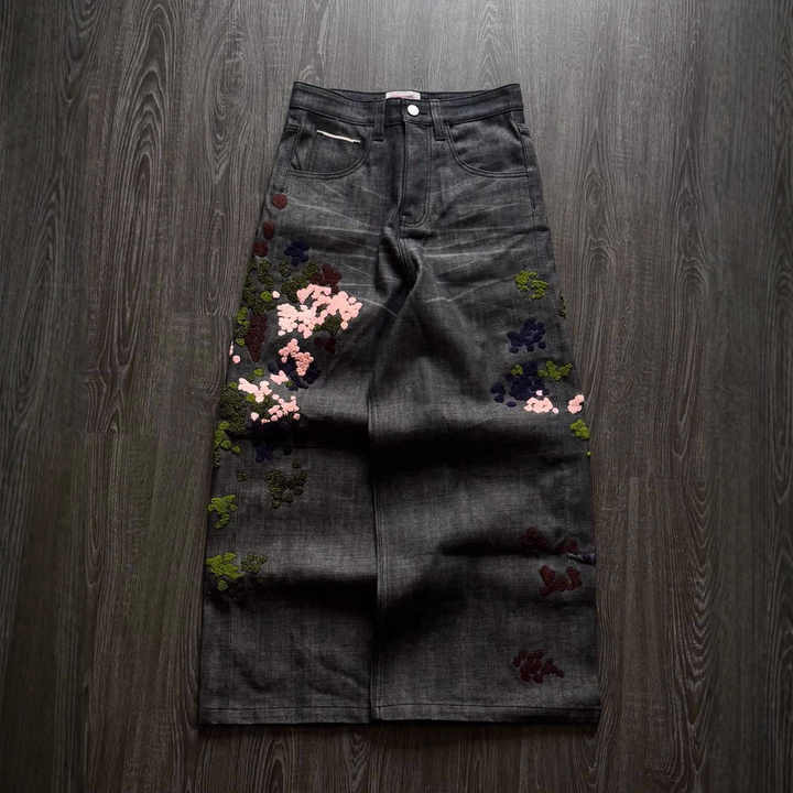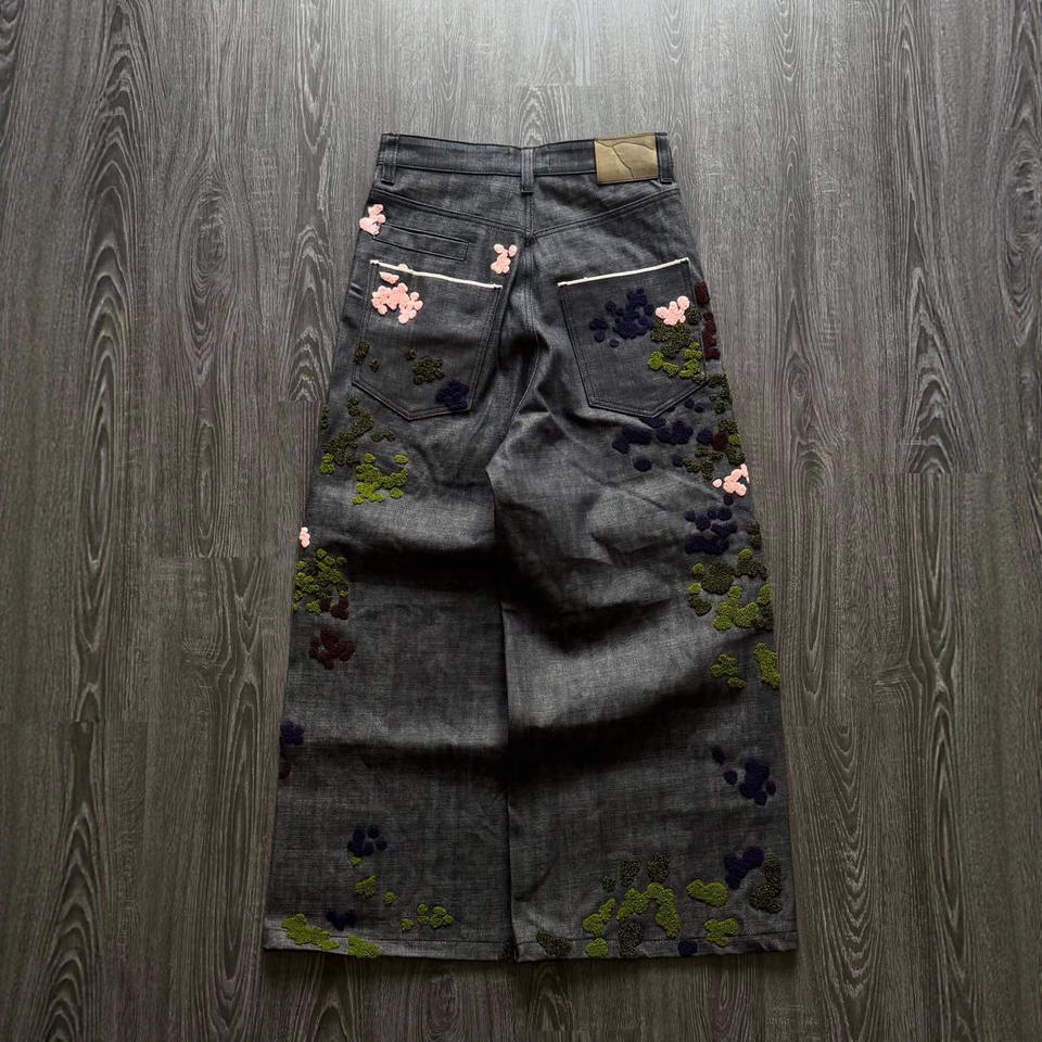 Jeans de Mezclilla Vintage para Hombre, Lavado Ácido, Bordado Personalizado, Corte Ajustado y Holgado, Estilo Cargo, Pierna Ancha, Textura Rugosa