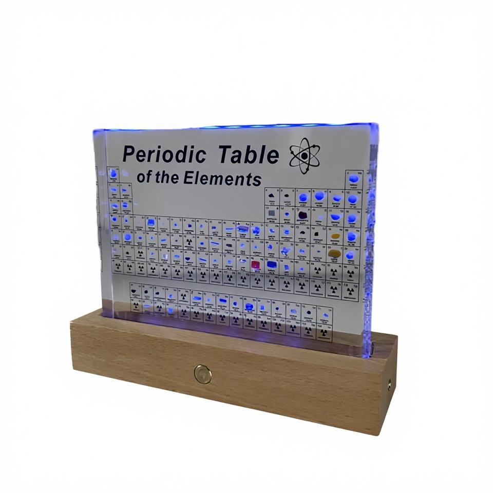 Exhibidor de la Tabla Periódica de Acrílico con 83 Muestras Reales y Retroiluminación LED, Base de Madera Maciza, Personalizable, Clásico, Independiente
