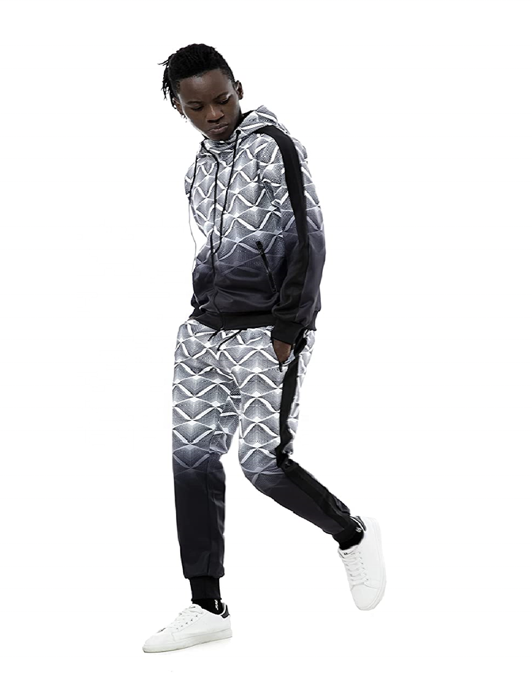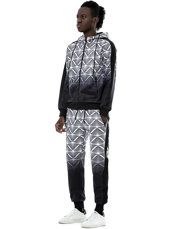 Desgaste de los hombres está impreso frontal con cremallera Sudadera con capucha traje de pista Slim sublimado cremallera capucha deportes sudor traje de 2 piezas de manga larga