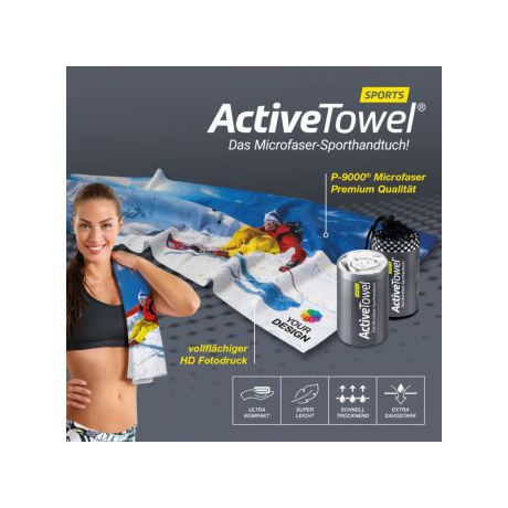 ActiveTowel® Sports 100x40 cm en lata redonda con tarjeta insertada personalizada
