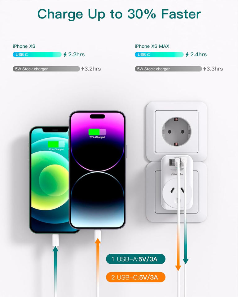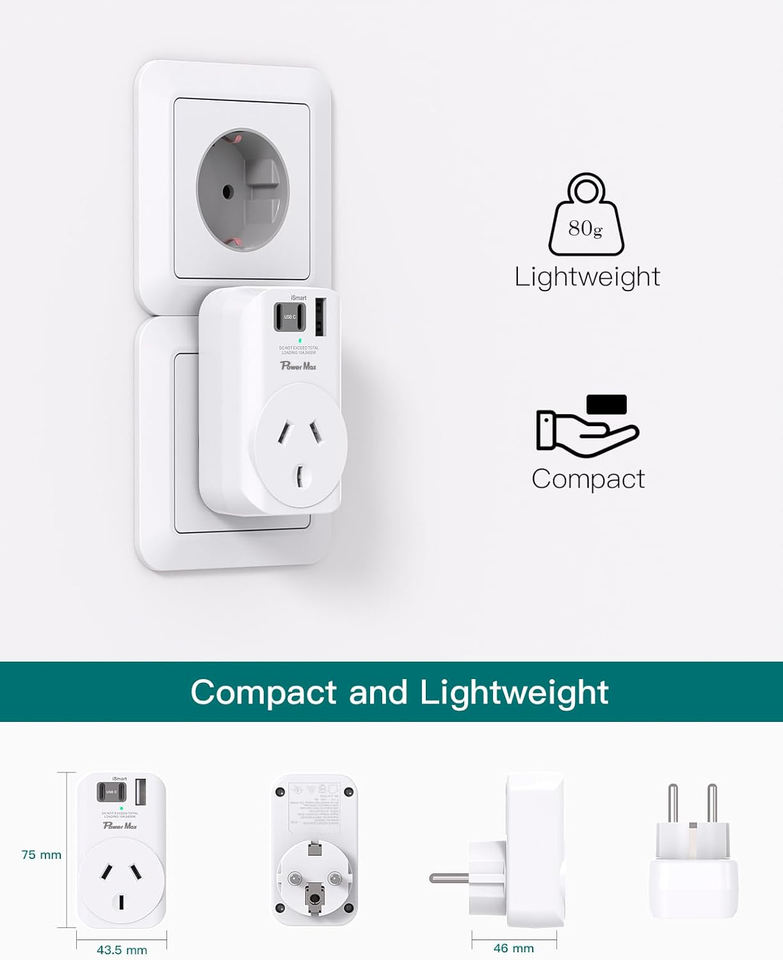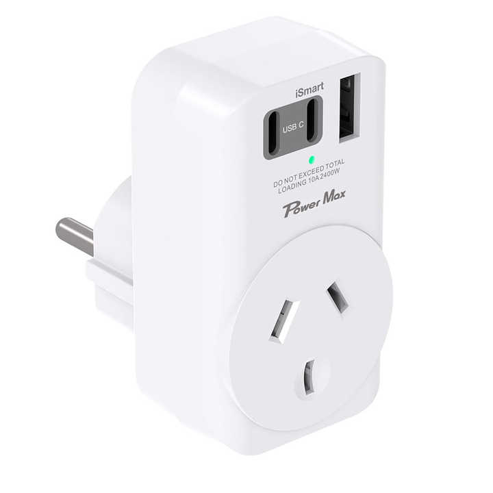 Adaptador de viaje europeo Addtam enchufe de alimentación 2 USB C 1 USB a AU a accesorios de viaje de la UE tipo E/F adaptador de salida cargador
