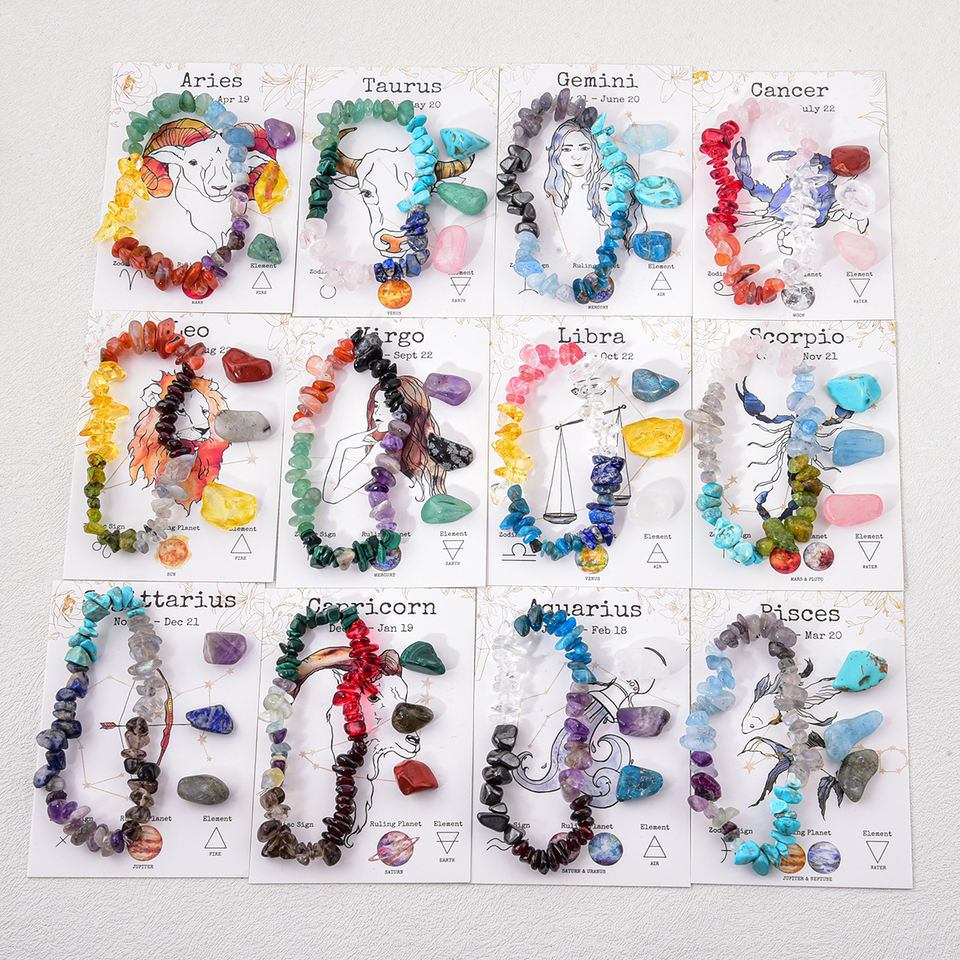Pulsera Ajustable Estilo Boho con 12 Signos del Zodiaco, Cuentas de Cristal Facetadas, Piedras Preciosas Trituradas, Elástica, Resistente y Duradera, Ideal para Regalo